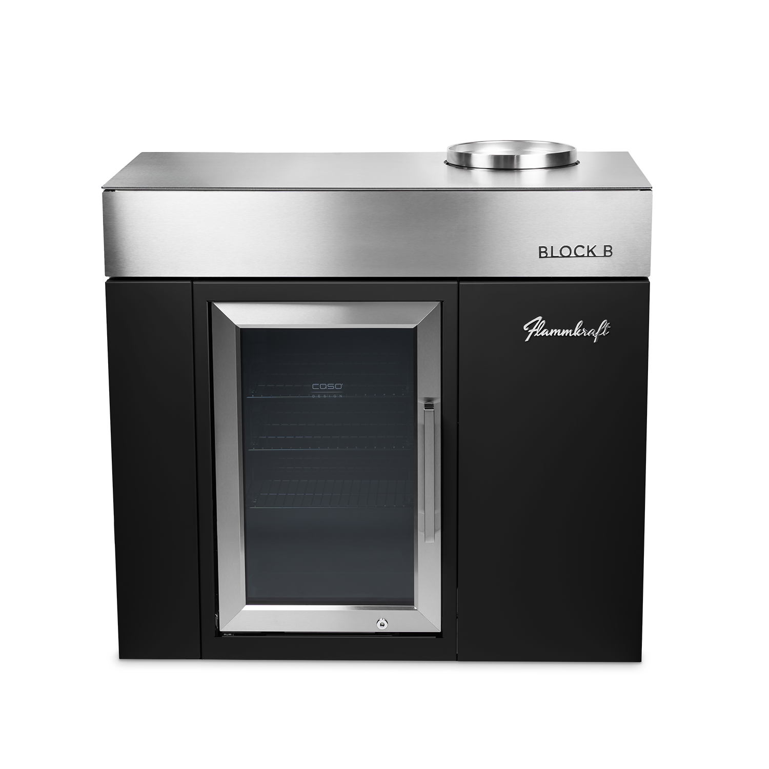Zentral im Unterbau integriert, passt er sich mit seiner Edelstahl-Verblendung und selbstschliessender Türe mit dunklem UV-Glas nahtlos in die klare Linienführung von Flammkraft ein. Technisch überzeugt er mit integrierter Beleuchtung, leisem Lauf und einer stufenlosen Temperaturreglung von -1 bis 10 °C.