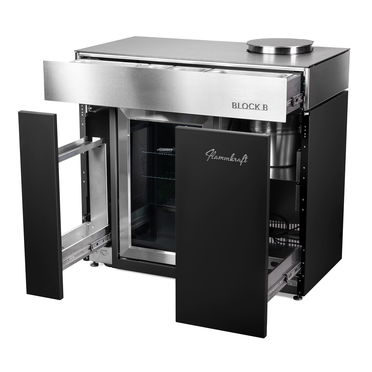Der Block B erweitert das Flammkraft-System um eine durchdachte Barausstattung: Im Unterbau integriert ist ein 63 l-Outdoor-Kühlschrank, ergänzt durch einen doppelwandigen, vakuumisolierten Eis-Eimer aus Edelstahl. Der Eimer kann in der dafür vorgesehenen Aussparung in der Arbeitsfläche platziert werden.