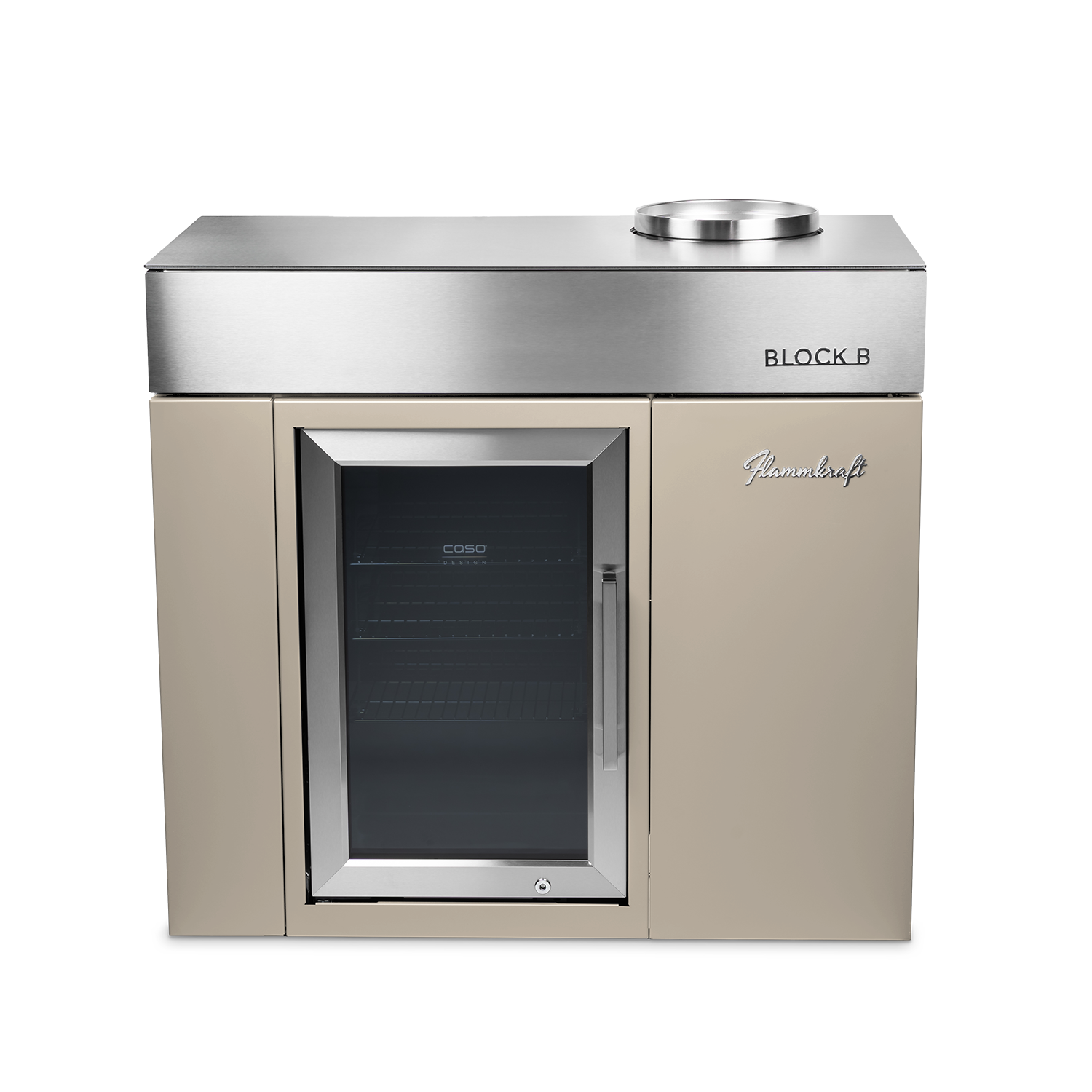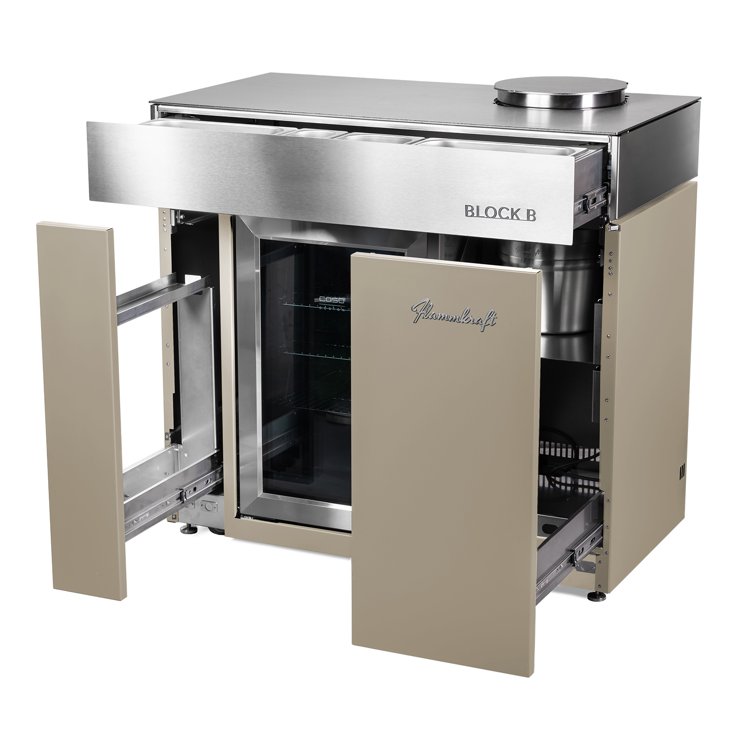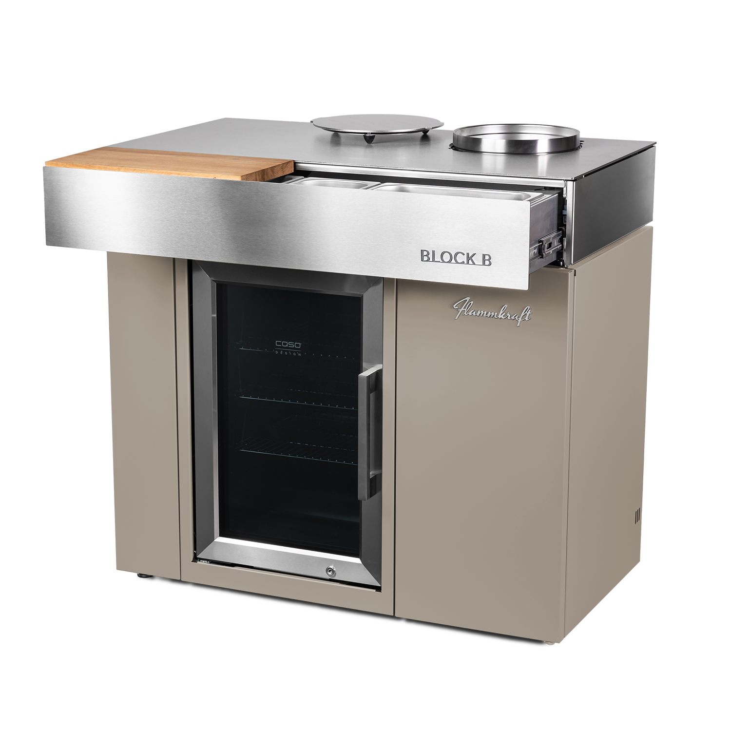Der Block B erweitert das Flammkraft-System um eine durchdachte Barausstattung: Im Unterbau integriert ist ein 63 l-Outdoor-Kühlschrank, ergänzt durch einen doppelwandigen, vakuumisolierten Eis-Eimer aus Edelstahl. Der Eimer kann in der dafür vorgesehenen Aussparung in der Arbeitsfläche platziert werden.