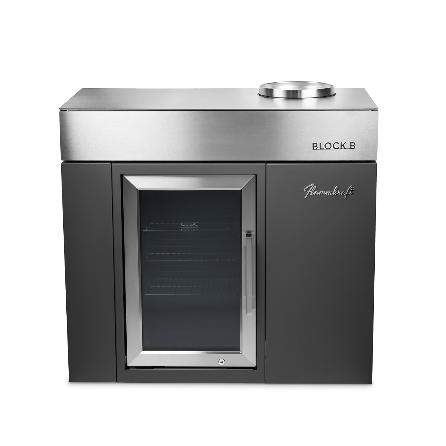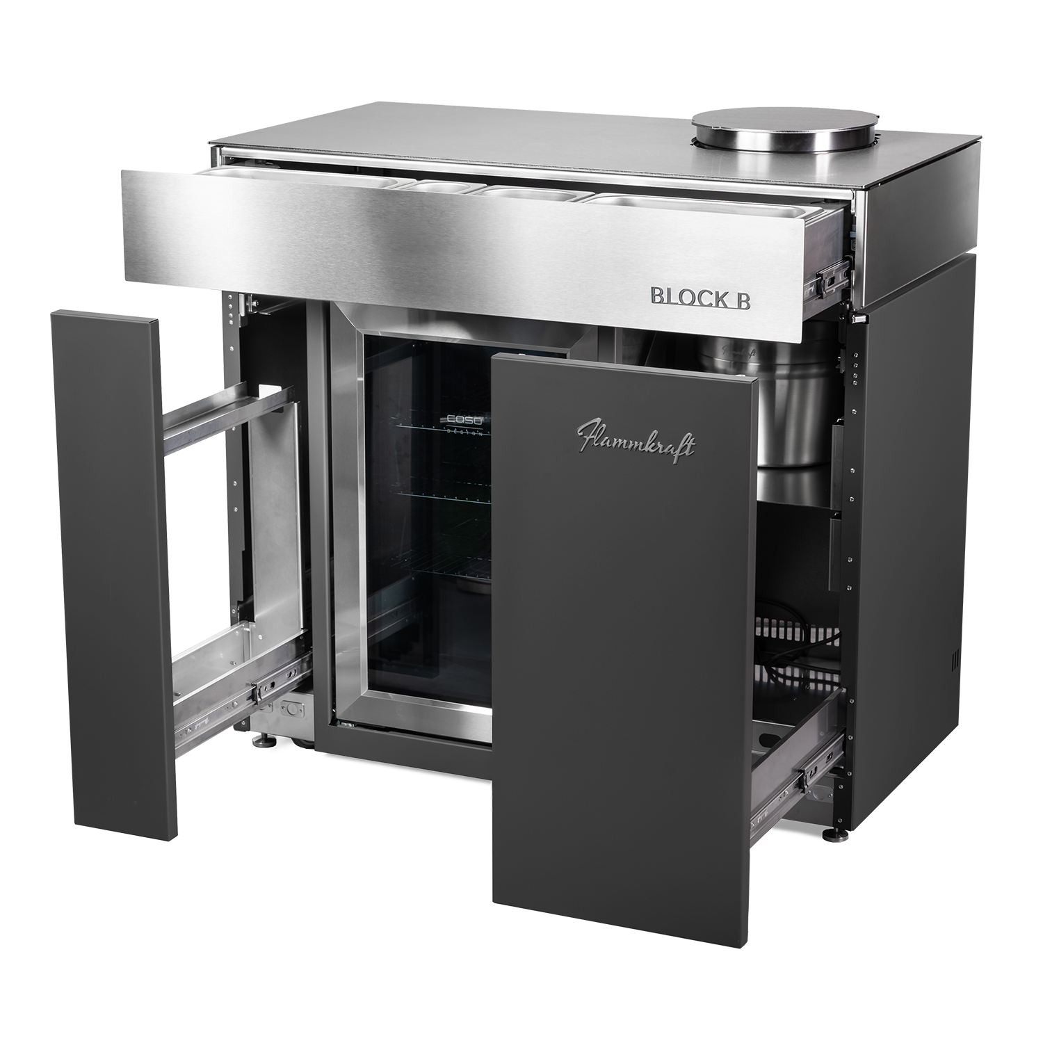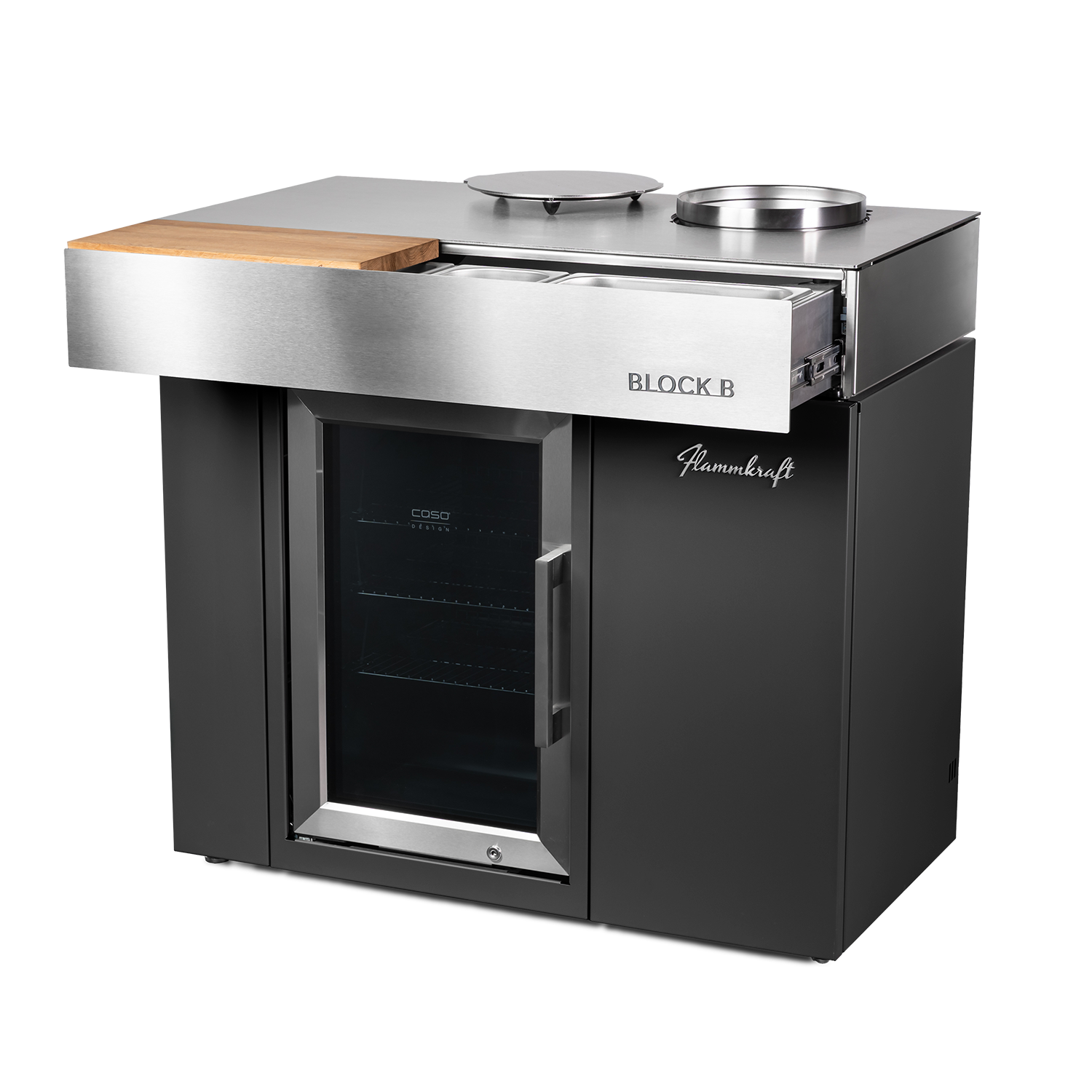 Der Block B erweitert das Flammkraft-System um eine durchdachte Barausstattung: Im Unterbau integriert ist ein 63 l-Outdoor-Kühlschrank, ergänzt durch einen doppelwandigen, vakuumisolierten Eis-Eimer aus Edelstahl. Der Eimer kann in der dafür vorgesehenen Aussparung in der Arbeitsfläche platziert werden.