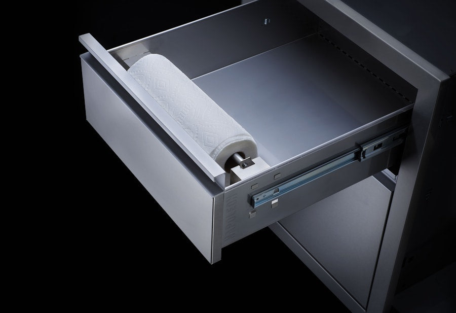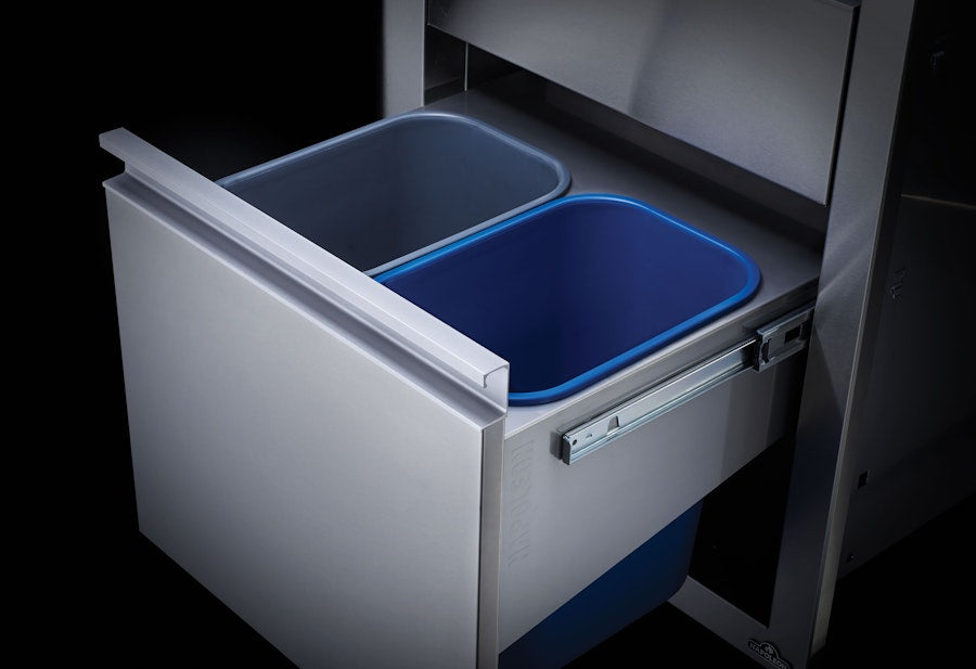 Die Gestaltung Deiner eigenen Grillinsel war noch nie so einfach wie mit den Einbaukomponenten von Napoleon. In jeder tollen Outdoor-Küche braucht man Stauraum; dieser Doppelschubladenschrank verfügt über einen Abfall- und Recyclingbehälter, der als Aufbewahrungsschublade oder als herausziehbare Ablage für Papierhandtücher verwendet werden kann.