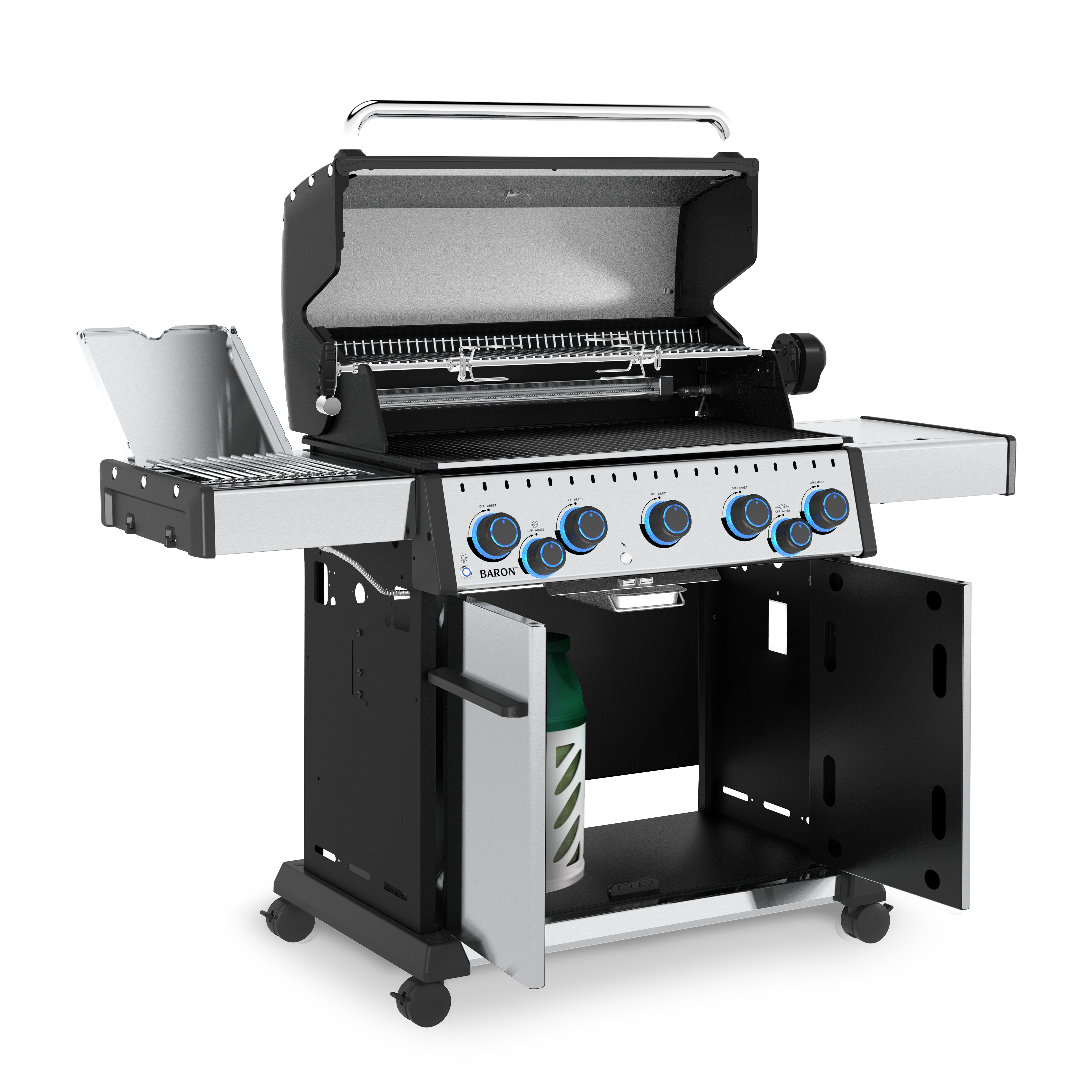 Die klappbaren Edelstahl-Seitenablagen bieten viel Arbeitsfläche und sind mit praktischen Zubehörhaken ausgestattet. Im geräumigen Cabinet-Unterwagen findet eine 11 kg Gasflasche problemlos Platz.