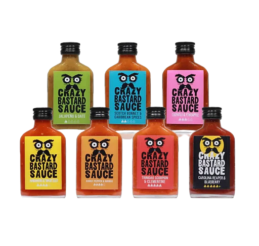 Crazy Bastard Sauce THE CRAZY SEVEN – Chili Set und Spiel - 7 Saucen Geschenkset